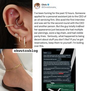 A man is expressing outrage and frustration after his friend missed out on a job opportunity due to her unconventional appearance, specifically her multiple ear piercings, leg chain, and visible panty lines. He believes that his friend’s appearance should not have been a factor in the hiring decision and is criticizing the company for their perceived superficiality.