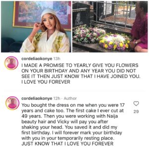 You bought the dress on me when you were 17 years and cake too. The first cake I ever cut at 49 years. Then you were working with Naija beauty hair and Vicky will pay you after shaking your head. You saved it and did my first birthday. I will forever mark your birthday with you in your temporarily resting place. JUST KNOW THAT I LOVE YOU FOREVER” she wrote on her IG page as she shred photos from the visit