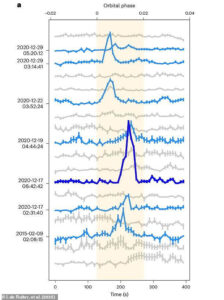 Dr Kilpatrick says: ‘The spectroscopic lines in these data allowed us to determine that the red dwarf is moving back and forth very rapidly with exactly the same two-hour period as the radio pulses.’
