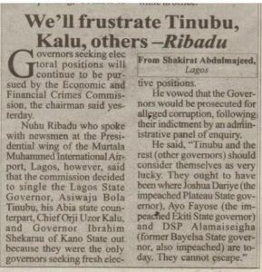 He claimed that Ribadu as chairman of the anti-graft agency, vowed in 2007 that he will frustrate the then governors, Tinubu, George Akume of Benue State and Orji Kalu of Abia State.