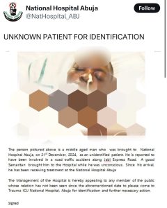 The National Hospital Abuja has appealed to the public for assistance in identifying an unconscious patient.