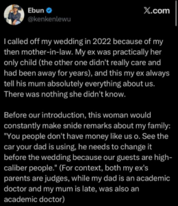 Before our introduction, this woman would constantly make snide remarks about my family: ‘You people don’t have money like us o. See the car your dad is using, he needs to change it before the wedding because our guests are high-caliber people.’ (For context, both my ex’s parents are judges, while my dad is an academic doctor and my mum is late, was also an academic doctor).