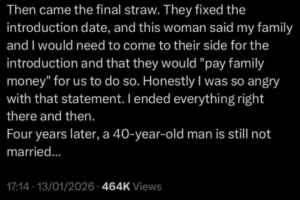 Then came the final straw. They fixed the introduction date, and this woman said my family and I would need to come to their side for the introduction and that they would ‘pay family money’ for us to do so. Honestly I was so angry with that statement. I ended everything right there and then. Four years later, a 40-year-old man is still not married.”