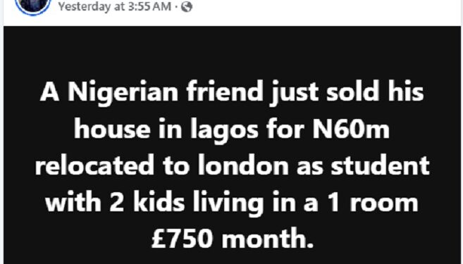 “A Nigerian friend just sold his house in Lagos for N60m relocated to London as student with 2 kids living in a 1 room £750 month,” he wrote.