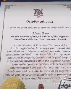 Nigerian Thespian Afeez Owo Honored in Canada