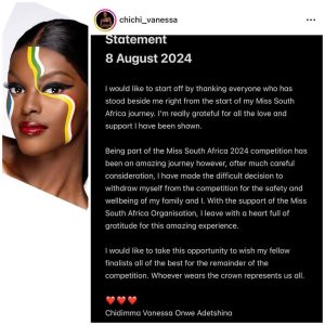 Nigeria’s Chidimma Vanessa Adetshina withdraws from Miss South Africa 2024 following controversy surrounding her mother’s citizenship.