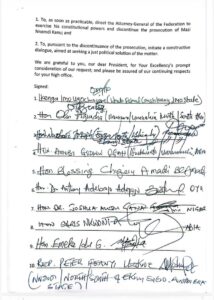 “We, the within-named federal lawmakers, hereby respectfully and earnestly request our dear President, His Excellency, Bola Ahmed Tinubu, as follows: To, as soon as practicable, direct the Attorney-General of the Federation to exercise his constitutional powers and discontinue the prosecution of Mazi Nnamdi Kanu; and To, pursuant to the discontinuance of the prosecution, initiate a constructive dialogue, aimed at seeking a just political solution of the matter.We are grateful to you, our dear President, for Your Excellency’s prompt consideration of our request; and please be assured of our continuing respects for your high office.”