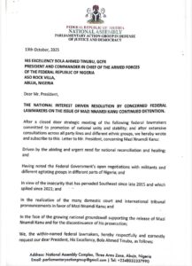 In a new twist to the growing call for Nnamdi Kanus release , a group of 44 Serving Federal lawmakers from different regions in Nigeria both north and south have written a two page letter and resolution to President Tinubu urging the President to invoke his constitutional powers and release Mazi Nnamdi Kanu from detention and convene an all inclusive political Roundtable with all parties to the challenges to find a lasting solution via a political window