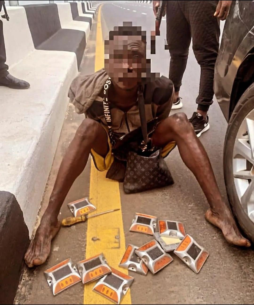 Operatives of Lagos Rapid Response Squad (RRS) around 10:00 a.m on Friday, June 6, arrested a suspected vandal removing LED road stud light on the newly renovated Third Mainland Bridge.