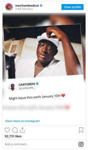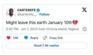 Social media users are unsure how to feel after Carter Efe posted an unusual caption via his social media page The skit maker, who often suffers backlash on social media due to his love for Wizkid, had many in fear While some have been laughing over it, others think that he might be trying to pass a message to the public