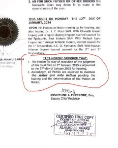 It is imperative to note that, from the CTC of the ruling of January 13th, the court asked the Parties in the case to maintain “status quo ante bellum”. No stay of execution was granted to Anyanwu, and as such, the Appeal Court’s ruling of December 20th 2024 remains binding.