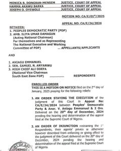 The is to inform Party members and the general public that, according to the CTC of the Court of Appeal Ruling of Monday 13th January, 2025, Senator Samuel Nnaemeka Anyanwu has been deceiving Nigerians and party members by claiming that the Court granted him the Stay he earlier filed on January 2nd, 2025, with respect to the December 20th Appeal Court ruling that sacked him as National Secretary of the Peoples Democratic Party (PDP).