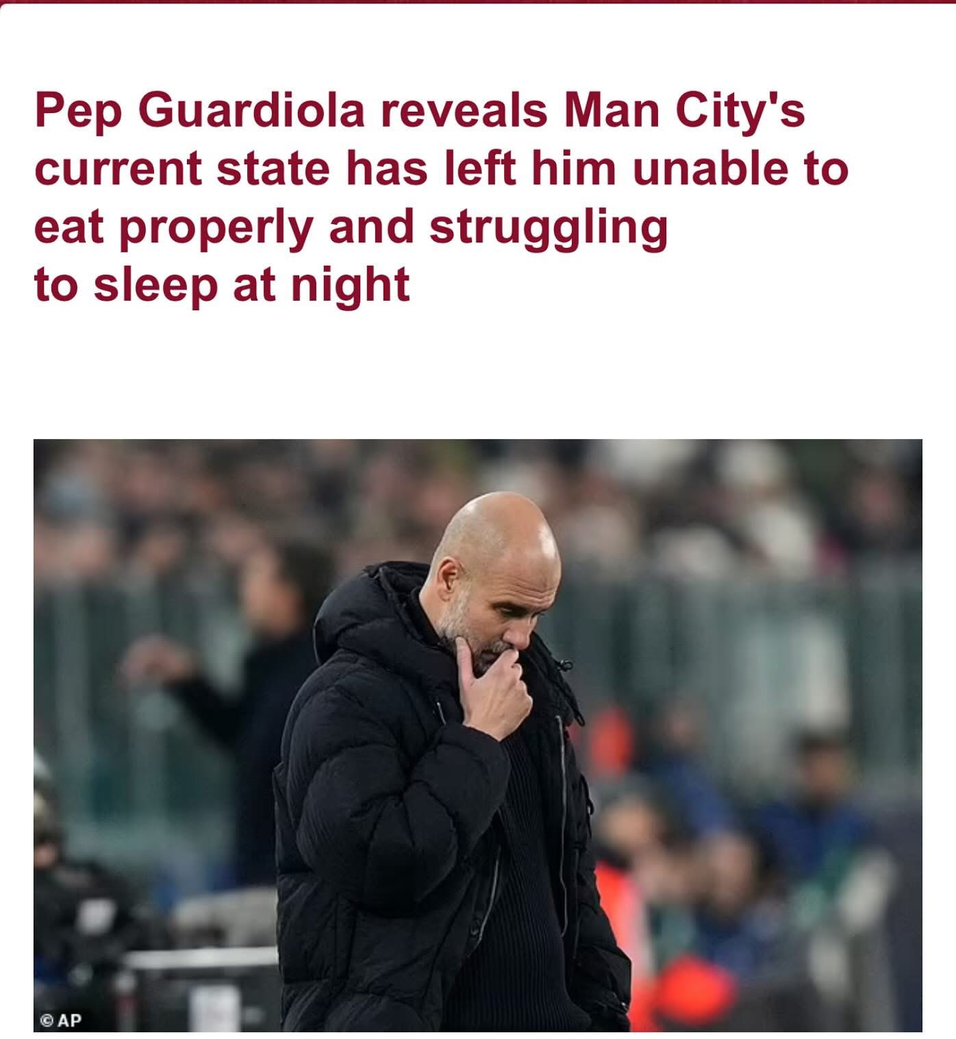 Manchester City coach, Pep Guardiola has revealed the club’s current form has left him unable to eat properly and struggling to sleep at night.