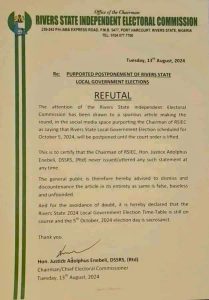 The attention of the Rivers State Independent Electoral Commission has been drawn to a spurious articie making the round, in the social media space purporting the Chairman of RSIEC as saying that Rivers State Local Government Election scheduled for October 5, 2024, will be postponed until the court order is lifted.