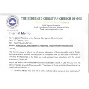 The church announced the suspension in a memo dated October 28, 2024, and signed by Sunday Akande, its national overseer.