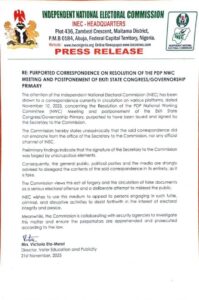 The attention of the Independent National Electoral Commission (INEC) has been drawn to a correspondence currently in circulation on various platforms, dated November 10, 2025, concerning the Resolution of the PDP National Working Committee (NWC) Meeting and postponement of the Ekiti State Congress/Governorship Primary, purported to have been issued and signed by the Secretary to the Commission.