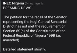 INEC in a tweet on its ‘X’ handle said; “The petition for the recall of the Senator representing the Kogi Central Senatorial District has not met the requirement of Section 69(a) of the Constitution of the Federal Republic of Nigeria 1999 (as amended)”.
