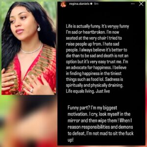 Actress Regina Daniels has shared another emotional series of posts on Instagram, opening up about sadness, pressure and how she has been forcing herself to stay strong.