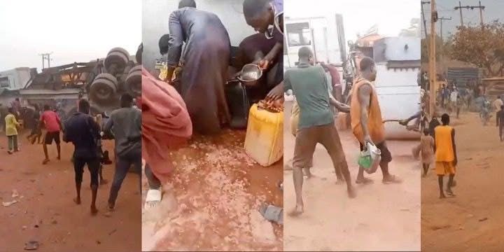 Despite the recent tragic incident in Suleja Local Government Area, new videos from Tuesday morning show residents in Bida approaching the fallen truck with jerry cans and buckets to collect the spilled groundnut oil near a filling station in the town.
