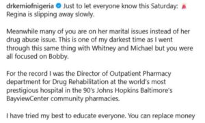 Meanwhile many of you are on her marital issues instead of her drug abuse issue. This is one of my darkest time as I went through this same thing with Whitney and Michael but you were all focused on Bobby.