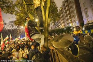 Police try to stop protesters climbing the outside wall toward the Iranian Embassy in London on January 11, 2026