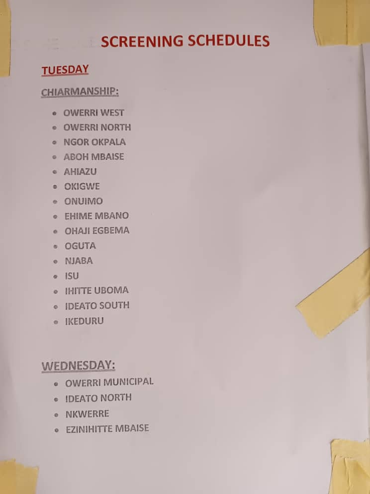 Scheduled dates for the screening of Imo APC Local Government Chairmanship and Councillorship aspirants, which starts tomorrow;