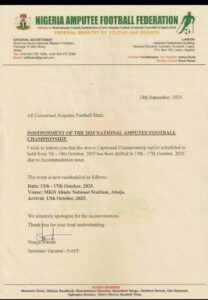 > “I wish to inform you that the above captioned championship earlier scheduled to hold from 7th–10th October 2025 has been shifted to 13th–17th October 2025 due to accommodation issues. The event is now rescheduled as follows: Date: 13th–17th October 2025. Venue: MKO Abiola National Stadium, Abuja. Arrival: 13th October 2025. We sincerely apologize for the inconveniences. Thank you for your kind understanding.”