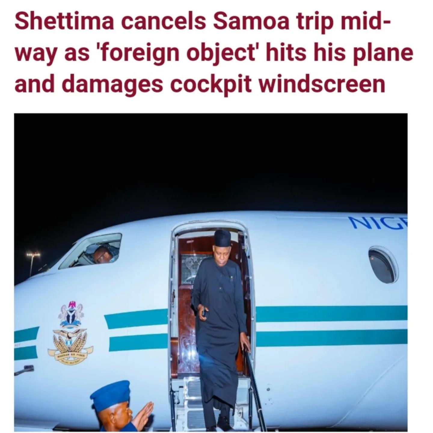 Shettima cancels Samoa trip midway as ‘foreign object’ hits his plane and damages cockpit windscreen