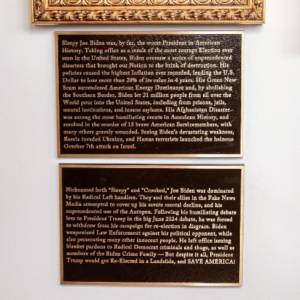 The plaques for Biden says that Biden took office in the White House “as a result of the most corrupt Election ever seen in the United States,” alluding to the 2020 presidential election whose results Trump sought to overturn.