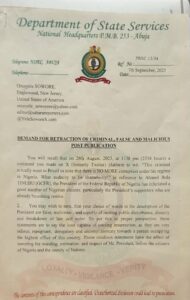 The @OfficialDSSNG has finally sent me a letter asking me to delete my tweet and @facebook posting against Asiwaju Bola Ahmed Tinubuu. Here is their letter and my response to their DG.