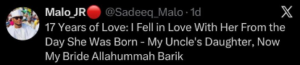 In the post, @Sadeeq_Malo revealed that he has loved his wife for 17 years, describing her as his uncle’s daughter, a statement that immediately caught the attention of social media users.