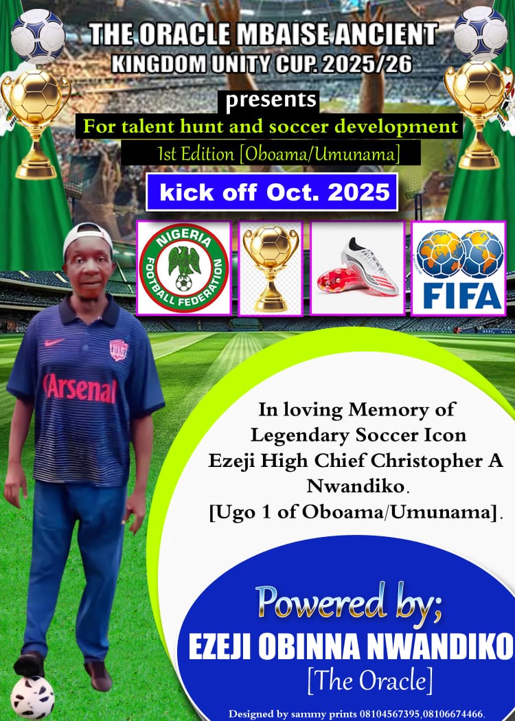 The ORACLE MBAISE ANCIENT KINGDOM UNITY TOURNEY among the villages in Oboama/Umunama Ezinihitte Mbaise is the masterpiece and another opportunity opened to showcase raw talents for partneship development of soccer withing mbaise Nation.