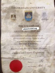 A viral photo trending online have shown a hard copy of original certificate of a Lagos state University Student.