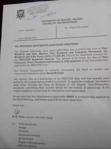 University of Ibadan confirms receipt of N201,114,650 as payment of tuition from Nigerian Education Loan Fund (NELFUND) for 1,370 student beneficiaries of the institution
