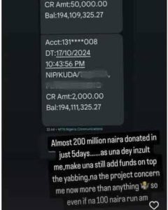 “Almost ₦200 million donated in just 5 days… As you all insult me, please keep adding funds along with the yabbing. The project is all that matters to me now. Even if it’s ₦100, just do it.”