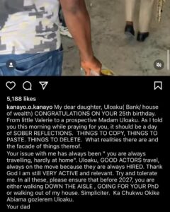 Kanayo O. Kanayo recently marked his daughter Valeria’s 25th birthday with a special celebration, complete with a serenade by instrumentalists. In a heartfelt message, he reflected on their relationship and acknowledged that his frequent absences due to work have been a point of contention.