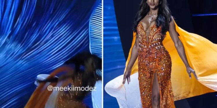 A really dramatic footage has shown Miss Jamaica taking a sudden fall on stage during the Miss Universe preliminary evening gown segment in Thailand.